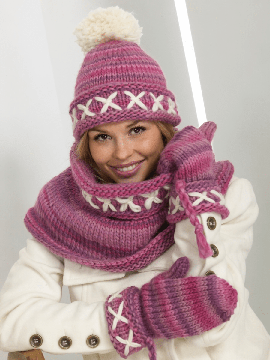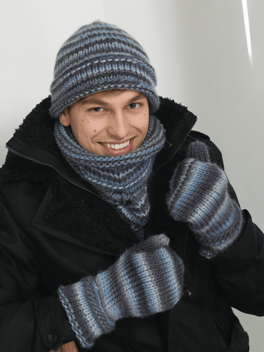 Strikk en lue, votter og skjerf i ull på rundpinne og strømpepinne. Prosjektet kombinerer glattstrikk, tommelkile og dekorativt broderi – et komplett vintersett.