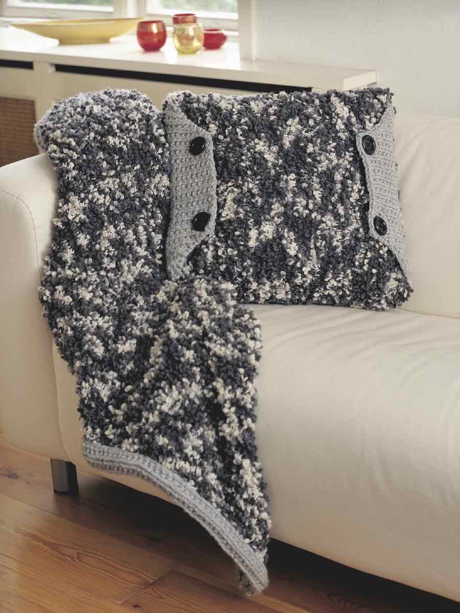 Koselig pledd og pute. Strikket i glattstrikk med ribbede kantstrimler i kontrastfarge. Puten har ribbet bakside med knappelukking. Perfekt sett til sofaen.