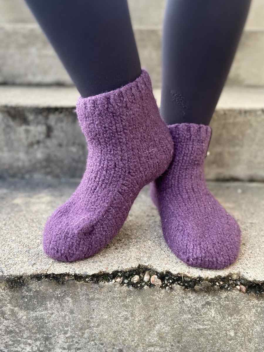 Tovede tøfler strikket i ett stykke som er sydd sammen på undersiden og midt bak. Tøflene er tovet på maskin.